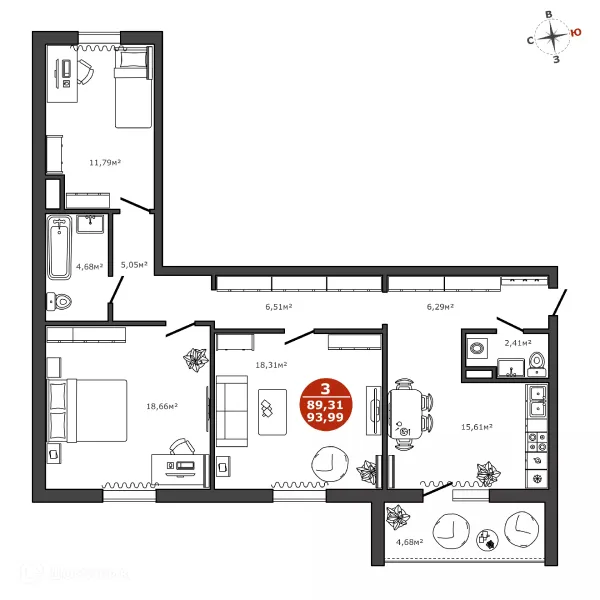 3 комн. квартира в Тюмени в ипотеку от 68 081 руб/месяц